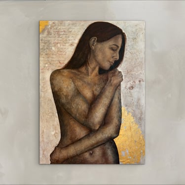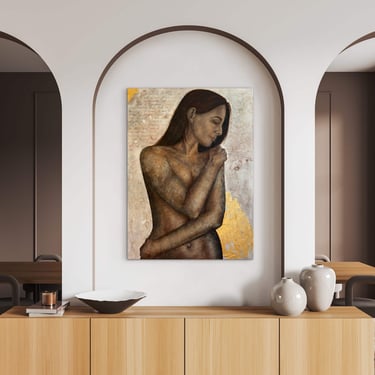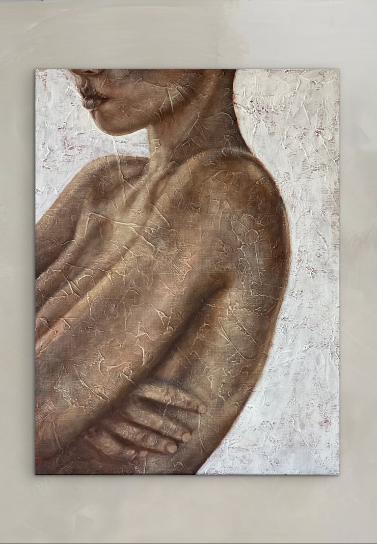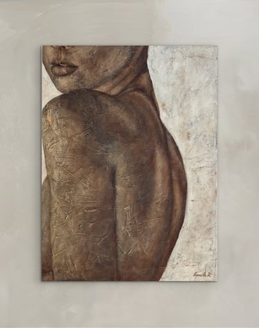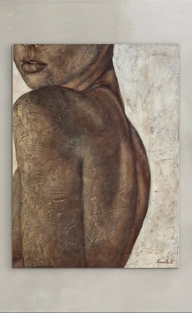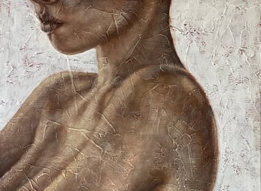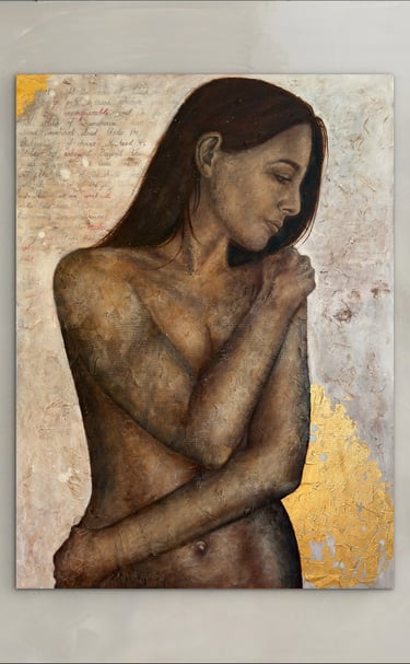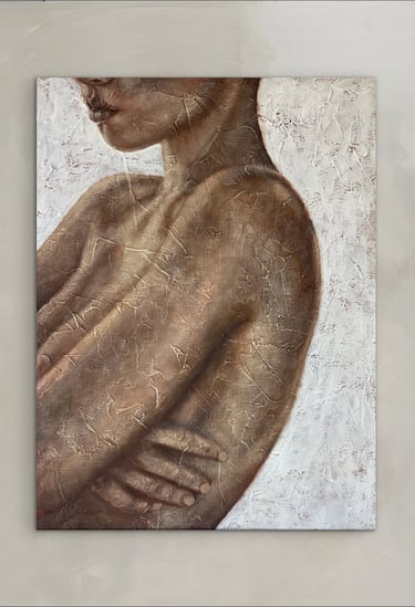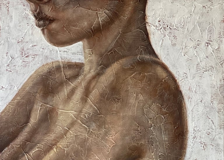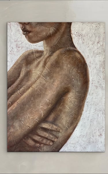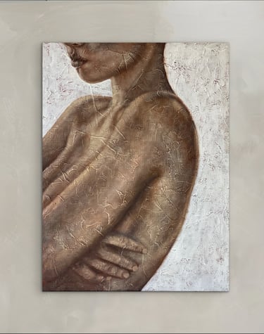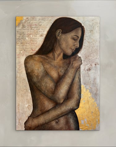 A portrait of quiet strength and vulnerability, where tender lines meet raw texture and gilded light. It speaks of endurance, self-acceptance, and the beauty of an unyielding spirit.