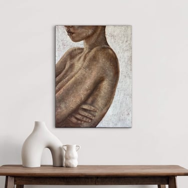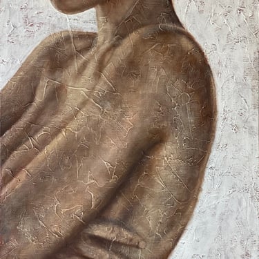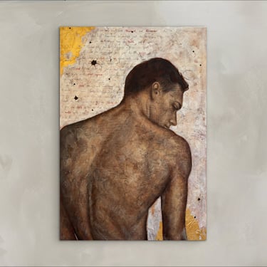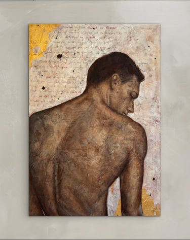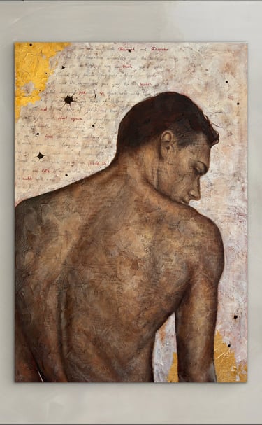 The figure, turned inward, carries the weight of experience across his back, his posture both vulnerable and resolute. Textured layers of earthy tones ground the body in humanity, while the fragments of poetry inscribed across the canvas invite reflection on strength, humility, and endurance.